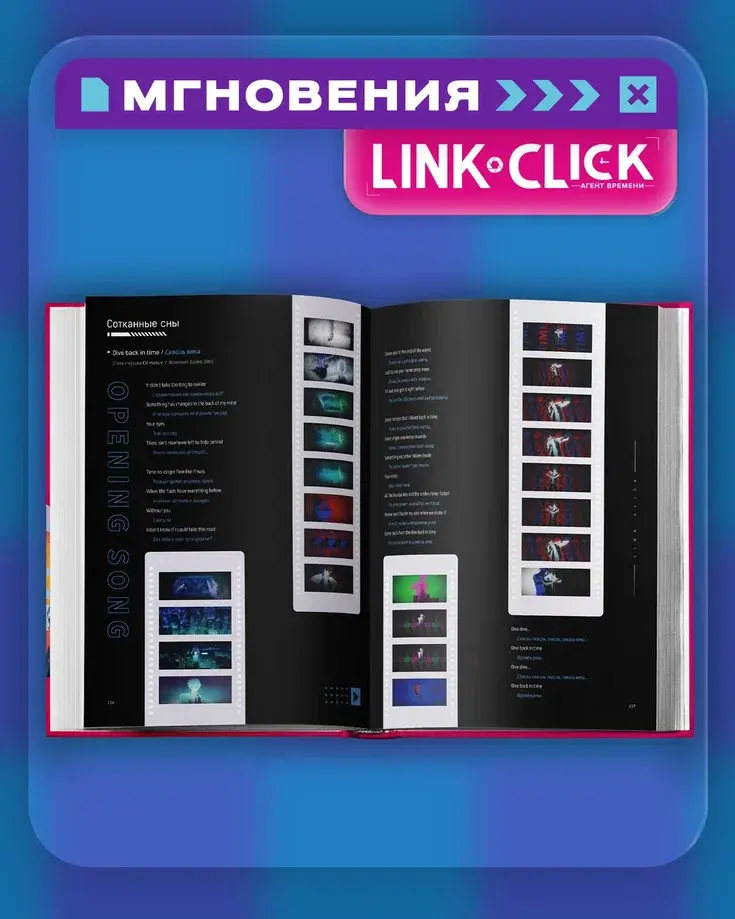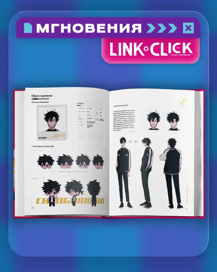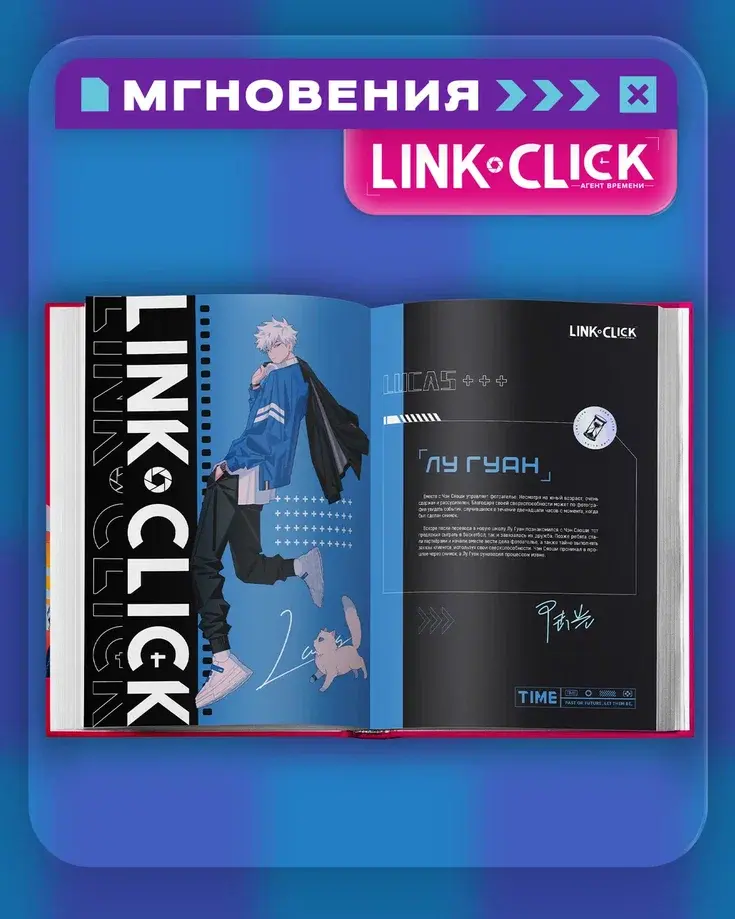 Узнайте всё о создании любимого сериала вместе с артбуком «Link Click. Агент времени. Мгновения». Здесь вы найдёте концепты персонажей и локаций с примечаниями создателей, коллекцию официальных артов, тексты песен, раскадровки опенинга и эндинга, интервью с режиссёром Ли Хаолином, а также скетчи и комментарии его команды.