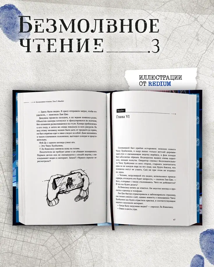 Обложка с покрытием софт-тач, уф-лаком, тиснением серебрянной фольгой и иллюстрацией SaiprinSK, 7 ч/б мини-иллюстраций от Redium, ляссе.