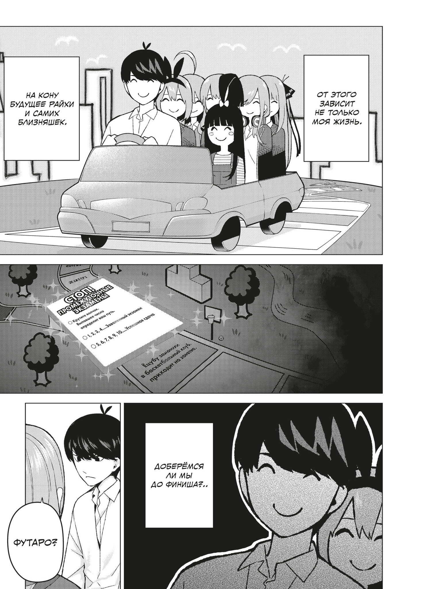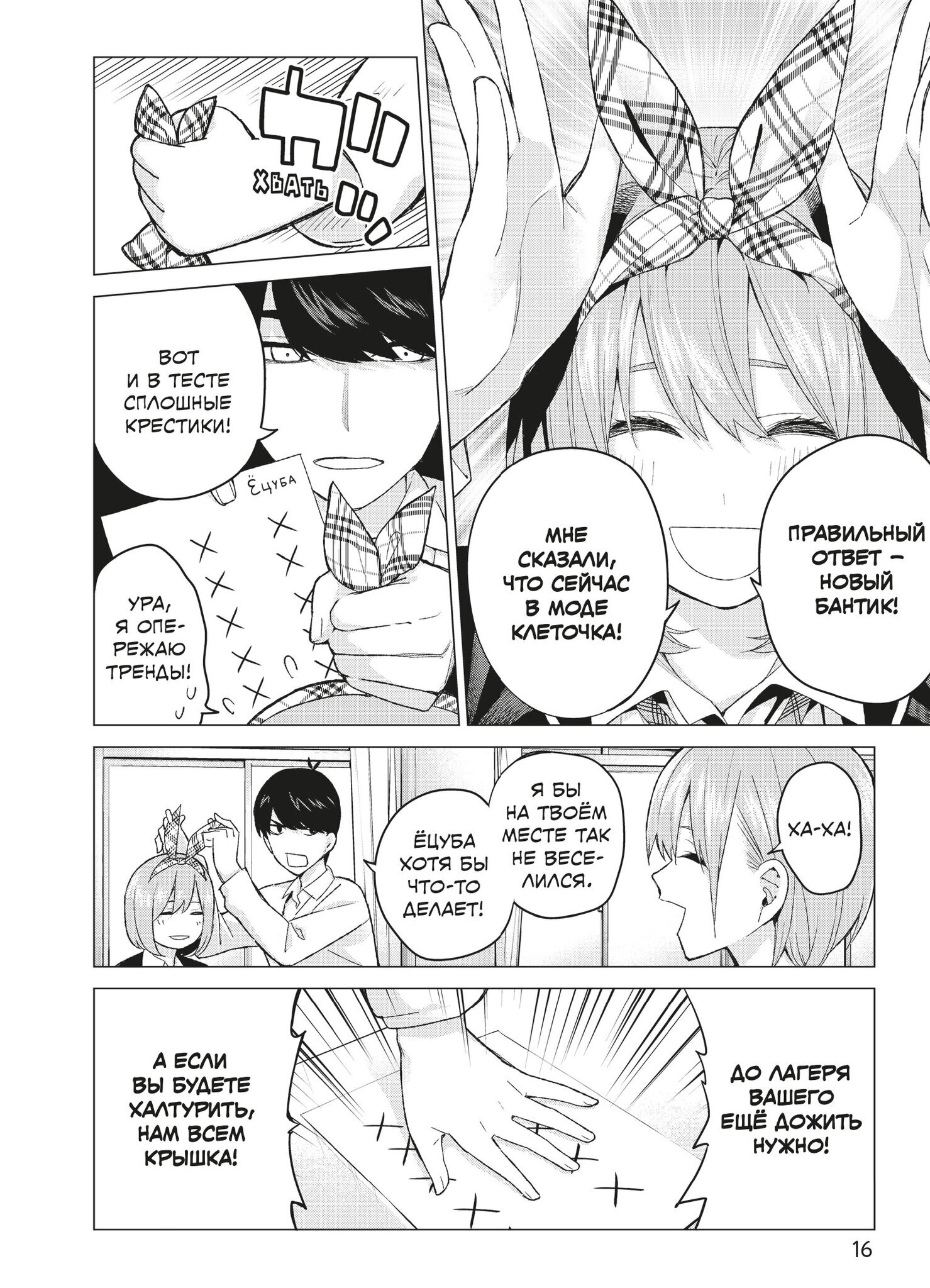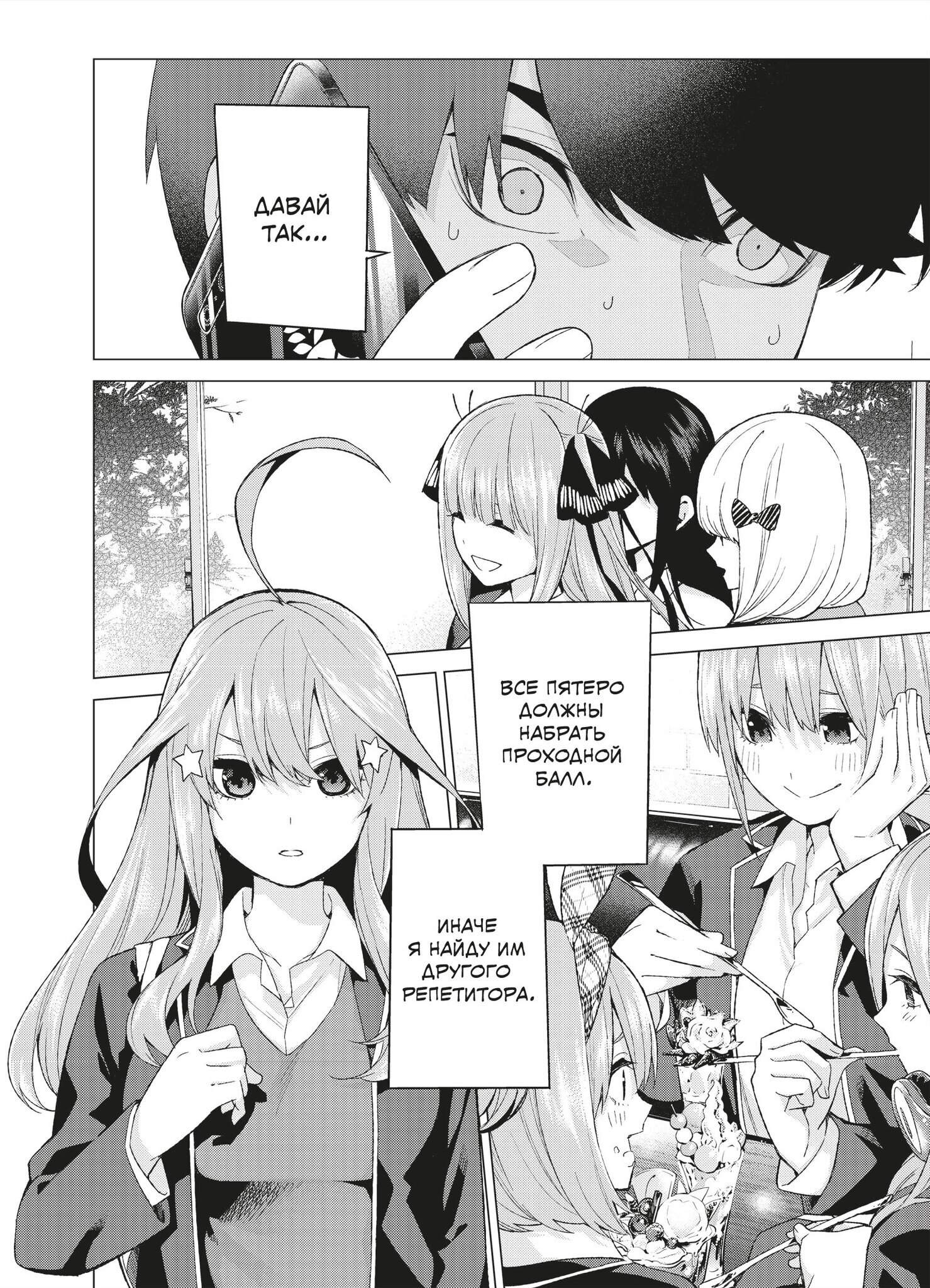 Пять сестёр Накано, поначалу не желавшие брать уроки у Футаро, постепенно проникаются к нему симпатией и соглашаются заниматься, а Футаро, в свою очередь, привязывается к ученицам: каждая из них по-своему талантлива и обаятельна. Но тут папа девочек ставит новое условие – если близняшки завалят промежуточный экзамен, он уволит репетитора раньше времени…